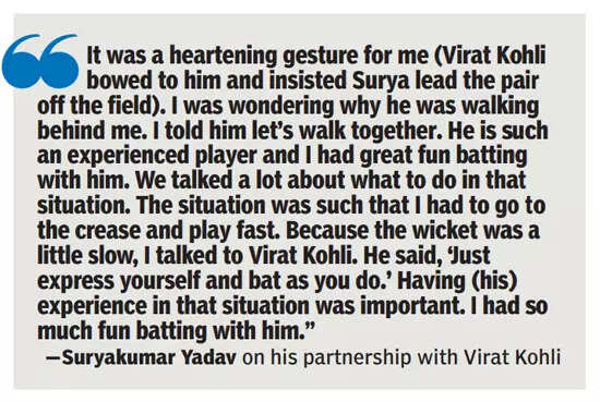 “It was a heartwarming gesture from Virat Kohli. I have never experienced it. I was wondering why he wasn’t walking ahead and then when I realised, I asked him to walk together. He is much more experienced than me,” Surya said, expressing his awe at Kohli’s gesture.