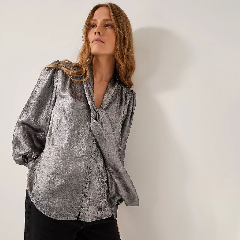 A bolder silver hue than Susanna's now sold out Monsoon blouse, this bright and shiny iteration has a large tie neck detail creating a statement, retro pussy bow. Wear loose over trousers, or highlight your waist by tucking into jeans or a skirt.