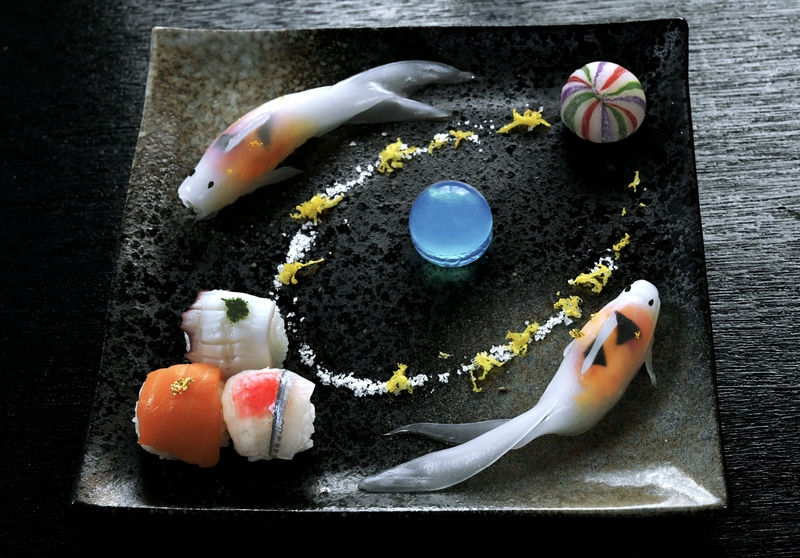 The two koi, however, were actually not luxury ornamental fish. I was at a sushi restaurant in Saiki, Oita Prefecture, admiring the beautiful pieces shaped like -- but not actually made of -- nishikigoi. On a serving plate, these edible delicacies looked as if they had just been taken out of a pond in a traditional Japanese garden. They seemed at that moment as if they were about to swim.