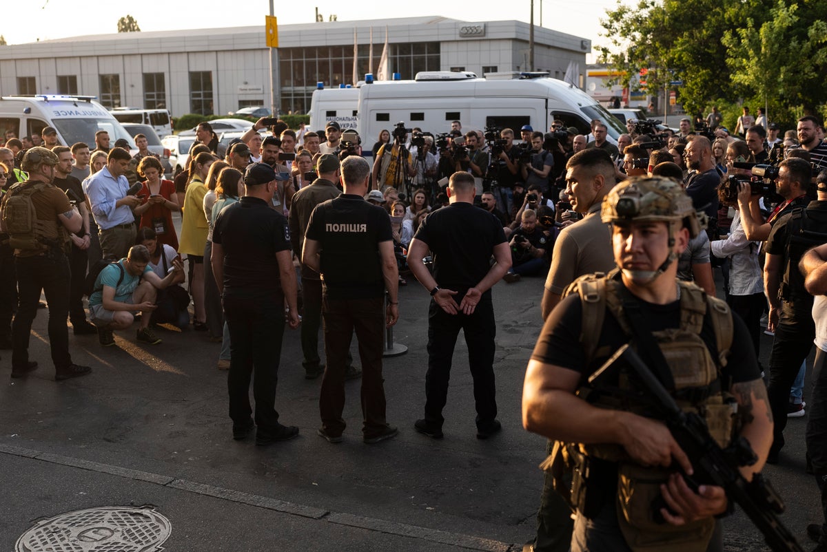 It wasn’t immediately clear how Humeniuk received the explosives and managed to bring them inside the court building. The two wounded officers belong to a special police unit.