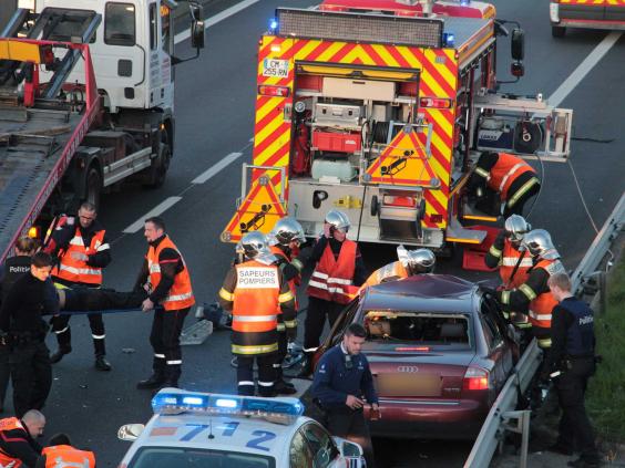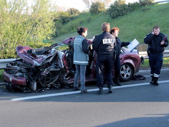French police said the car skidded on burst tyres into several vehicles involved in an earlier minor road accident on the A16 motorway.