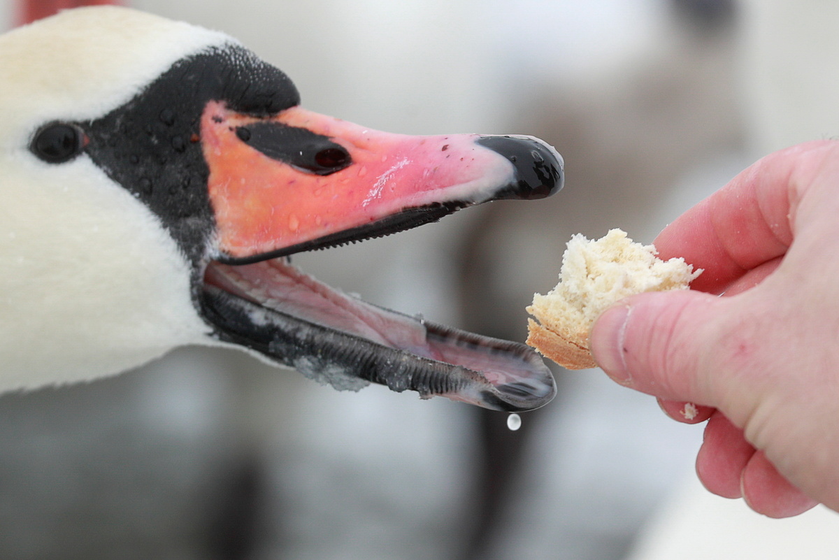 A local resident feeds a swan on the bank of a water reservoir of the Khmelnytskyi Nuclear Power Plant (KhNPP) near the town of Ostroh, Ukraine February 17, 2021. The reservoir, which turned into a local tourist spot, attracts dozens of swans every winter as it never freezes over due to the warm waters discharged from the plant. Picture taken with February 17, 2021. REUTERS/Valentyn Ogirenko