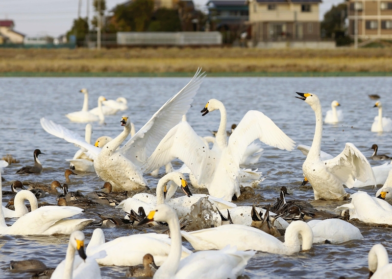Swans that migrated south are wintering in rice paddies in Inzai, Chiba Prefecture. Residents began filling the paddies with water after every harvest about 30 years ago, when six swans were seen in the area. According to observers at Motono Elementary School, the first three swans of this season arrived on Oct. 29, and as of Wednesday morning, 96 swans had been spotted. It is said there have been seasons when more than 1,000 swans have been seen. The waterfowl will stay at the rice paddies until around March.
