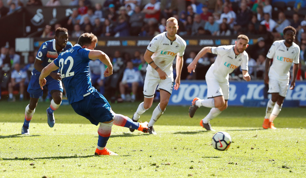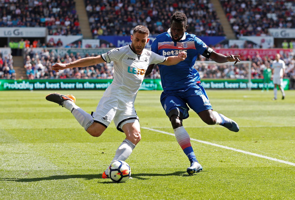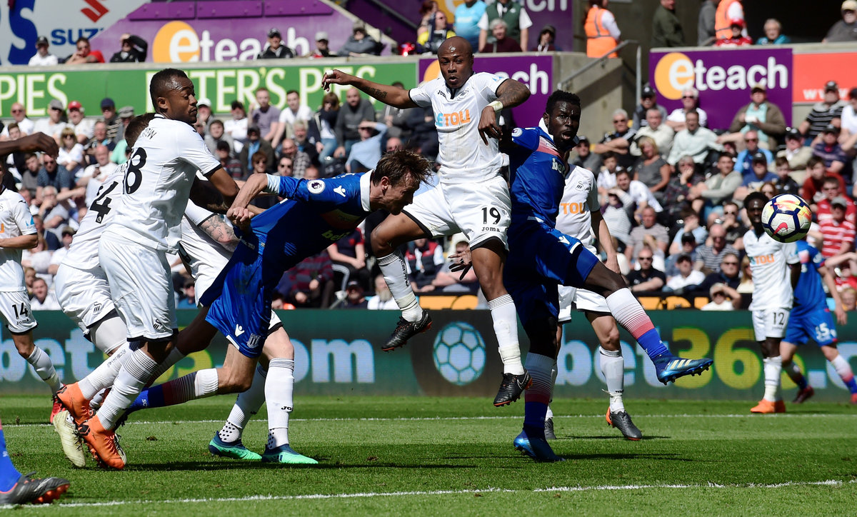But by halftime Swansea, without an away win in 13 previous away games, led with goals by Senegal's Badou Ndiaye and then Peter Crouch. Xherdan Shaqiri even missed a penalty for Stoke.