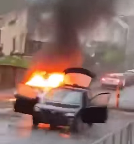 Footage posted online showed crowds cheering as a vehicle rolled down a hill towards another blazing car in the middle of the road in the city’s Mayhill area.
