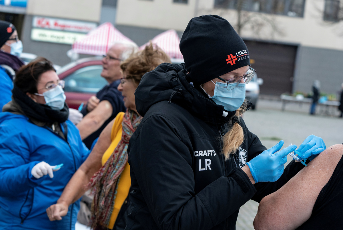 FILE PHOTO: A member of nursing staff vaccinates a person against influenza as vaccination to high risk group patients is administered outdoors to prevent the spread of the coronavirus disease (COVID-19), in Trelleborg, southern Sweden November 19, 2020. TT News Agency/Johan Nilsson via REUTERS