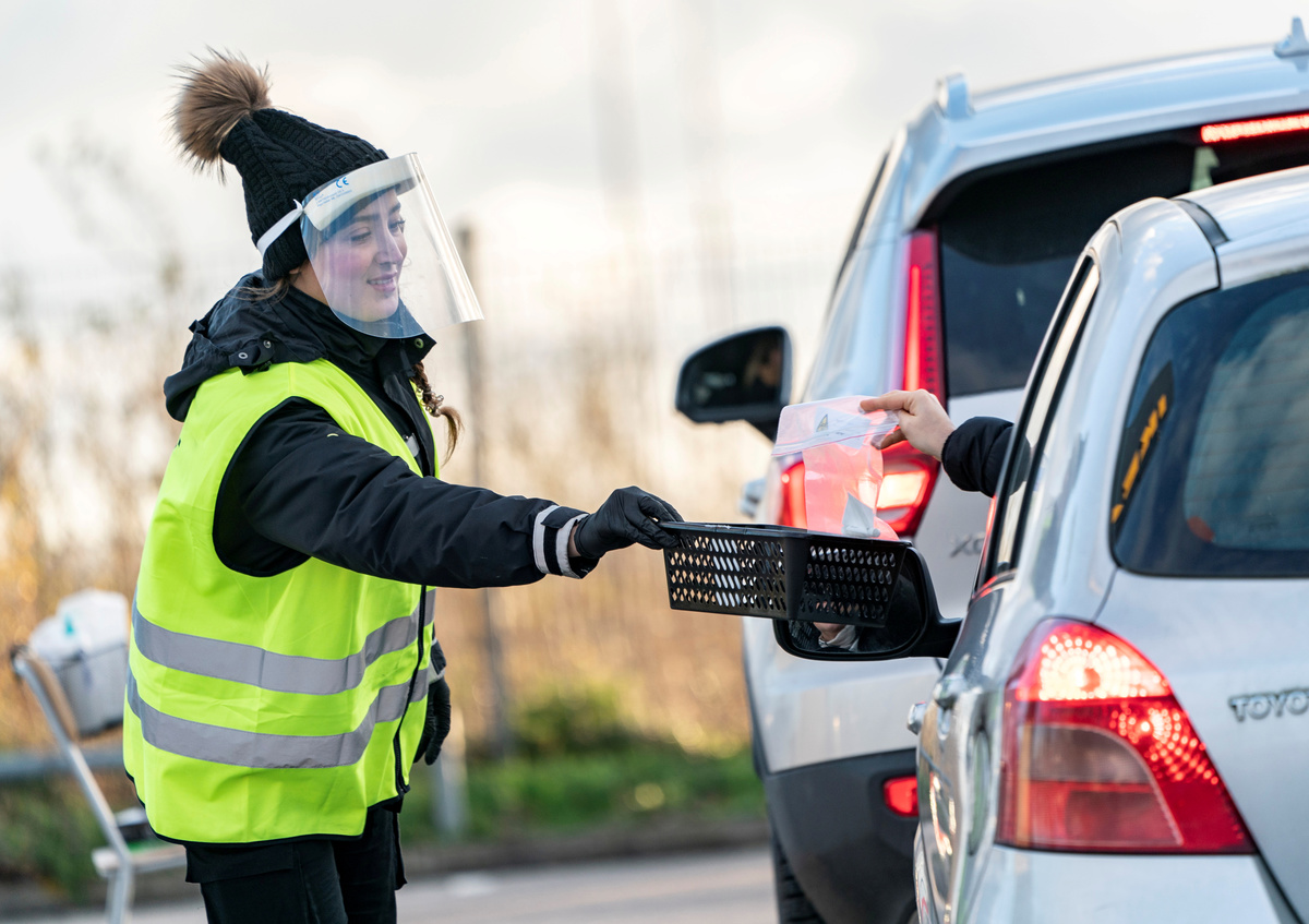 FILE PHOTO: A person waring a protective mask collects coronavirus self tests from people in cars at a testing site in the car park of Svagertorp railway station, amid the coronavirus disease (COVID-19) outbreak, in Malmo, Sweden, November 27, 2020. TT News Agency/Johan Nilsson via REUTERS