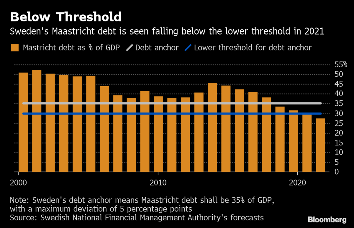Swedish government debt is at its lowest in 40 years and falling. According to the National Financial Management Authority, debt will sink below 35 percent of gross domestic product this year and breach 30 percent in 2021. At that point, the government will be required by law to explain to parliament why debt is so low.