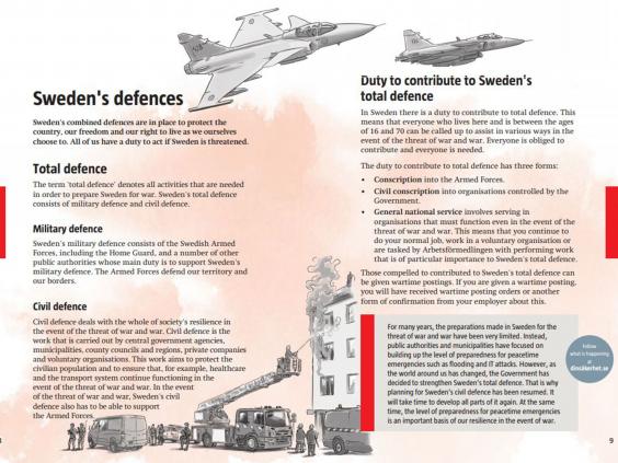 It tells Swedes they have a duty to act if their country is threatened for "total defence," and was first published during the Second World War and subsequently during the Cold War.