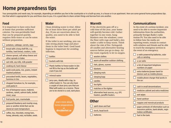 It includes a checklist of emergency supplies homes should contain, including canned food, pasta and blankets.