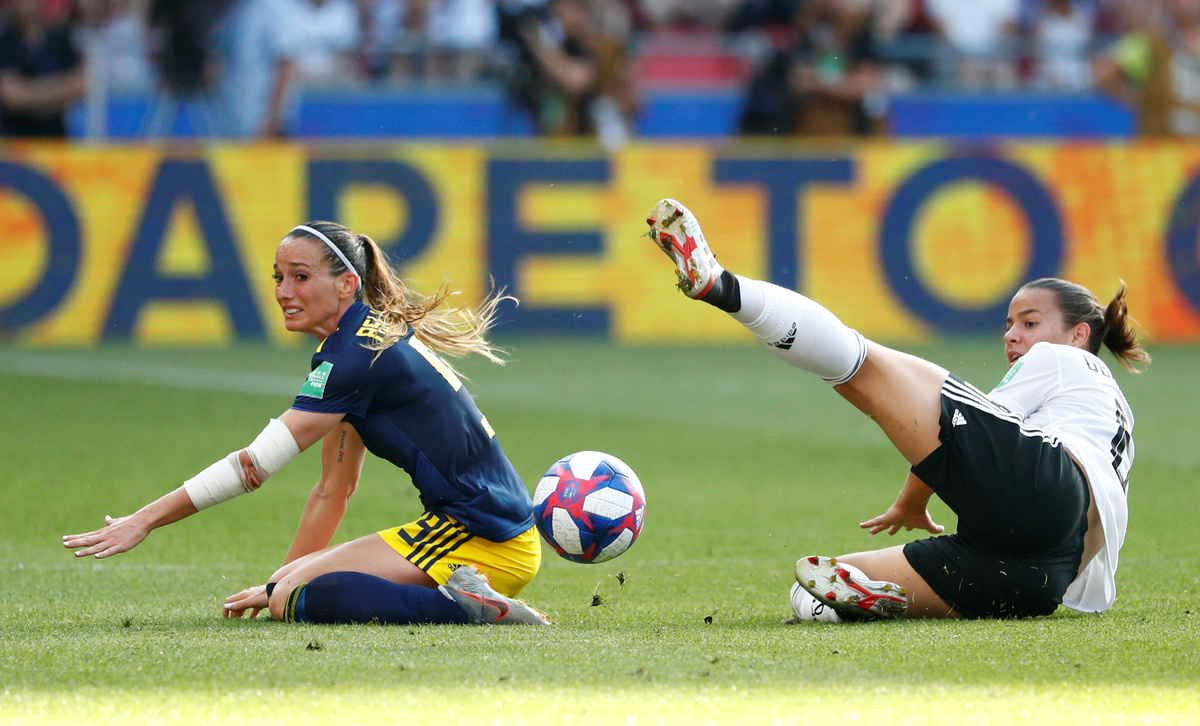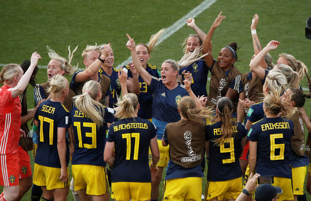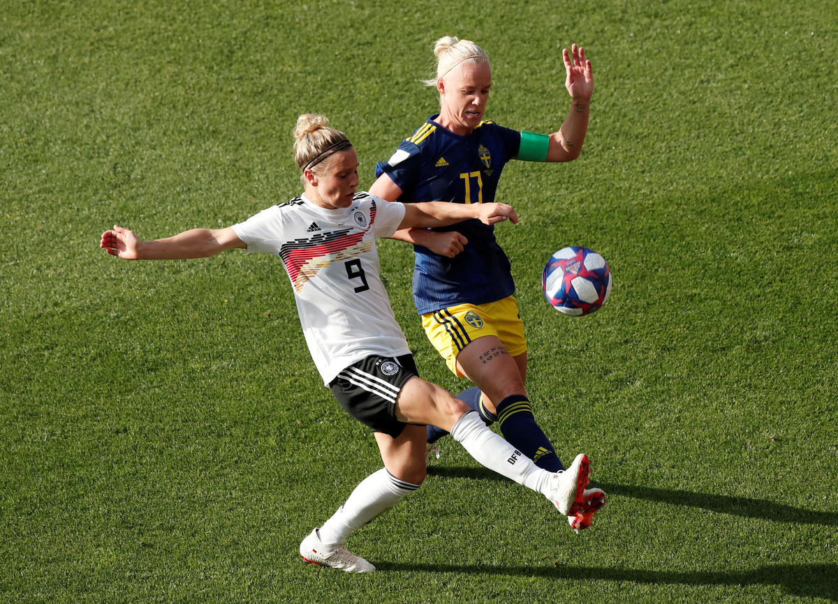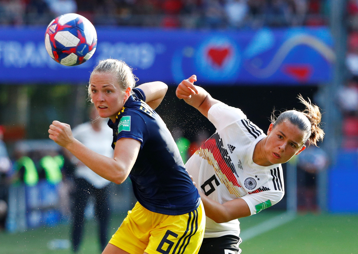RENNES, France (Reuters) - Sweden ended Germany's hopes of a third women's World Cup win, coming from behind for a surprise 2-1 quarter-final victory on Saturday thanks to goals from Sofia Jakobsson and Stina Blackstenius.