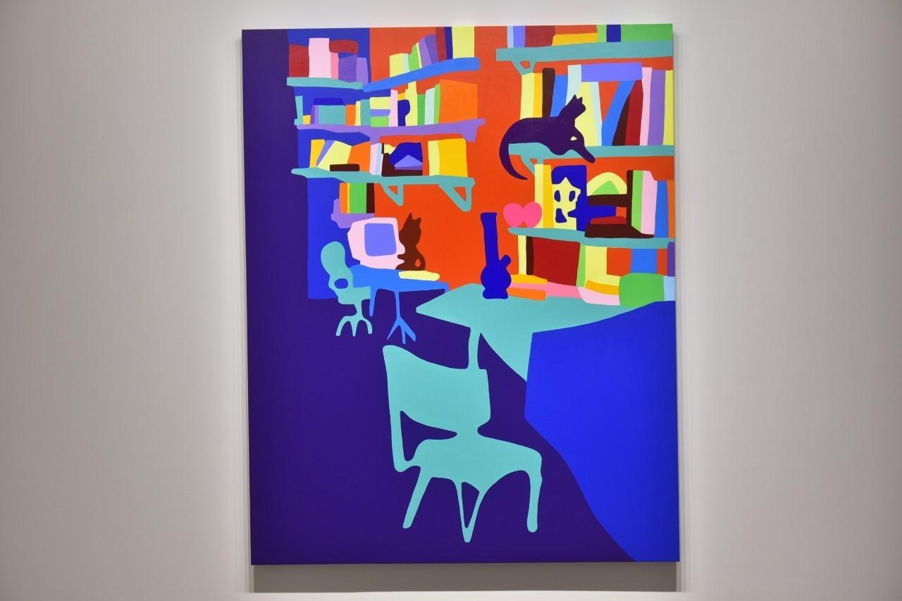 His six brilliantly cartoonist paintings on the gallery's first floor have a dynamic combination of red missiles, naked-blood ladies as well as cartoon tanks, ships and aeroplanes in different shades of blue. This set elaborates on the lively, upbeat mood during the current global conflict. Another series in the second space focuses on surreal interiors painted in lush, vibrant colours. This palette enlivens old subjects such as his kitchen furniture, posters and pets in an entirely fresh way. Additionally, James always adds cats as his silent witnesses in the picture because he loves them.