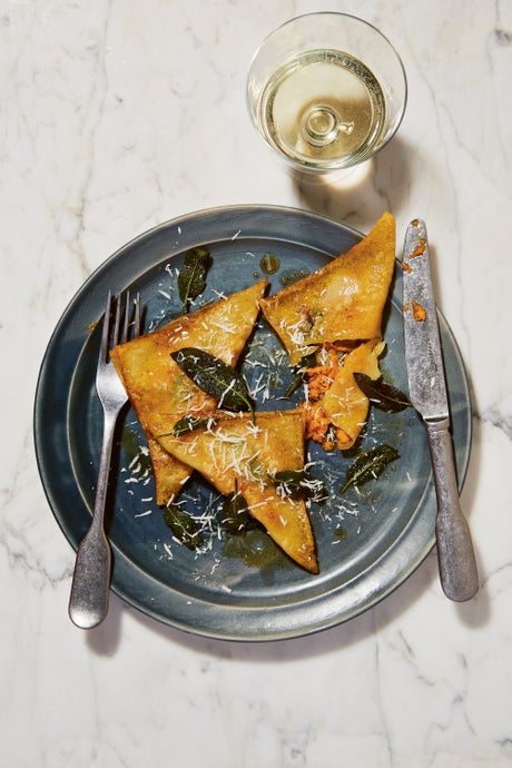 Cut each lasagne sheet in half with kitchen scissors, so you have 12 squares. Dollop one tablespoon of the sweet potato mixture into the middle of each square and top each one with a sage leaf. Fold the pasta over the filling to form a rough triangle and press to seal the edges together. Leave to cool on a lightly oiled tray.