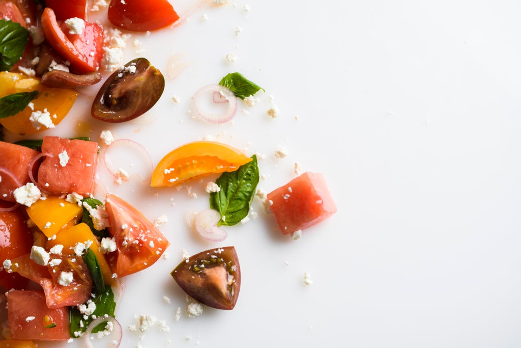 TOMATO AND WATERMELON SALAD WITH BASIL AND GOAT CHEESE