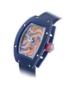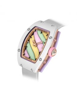 "Rather than lapidation, we have chosen to sand the grand feu enamel on the RM 07-03 Marshmallow in order to preserve the volume and appearance of the material itself. This is how we achieve the fluffy quality of the marshmallow on the dial, for instance," she said.