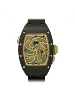 The dial of RM 37-01 Sucette features a green and garnet swirl, with a date display under 12 o'clock and a function selector at 4 o'clock.