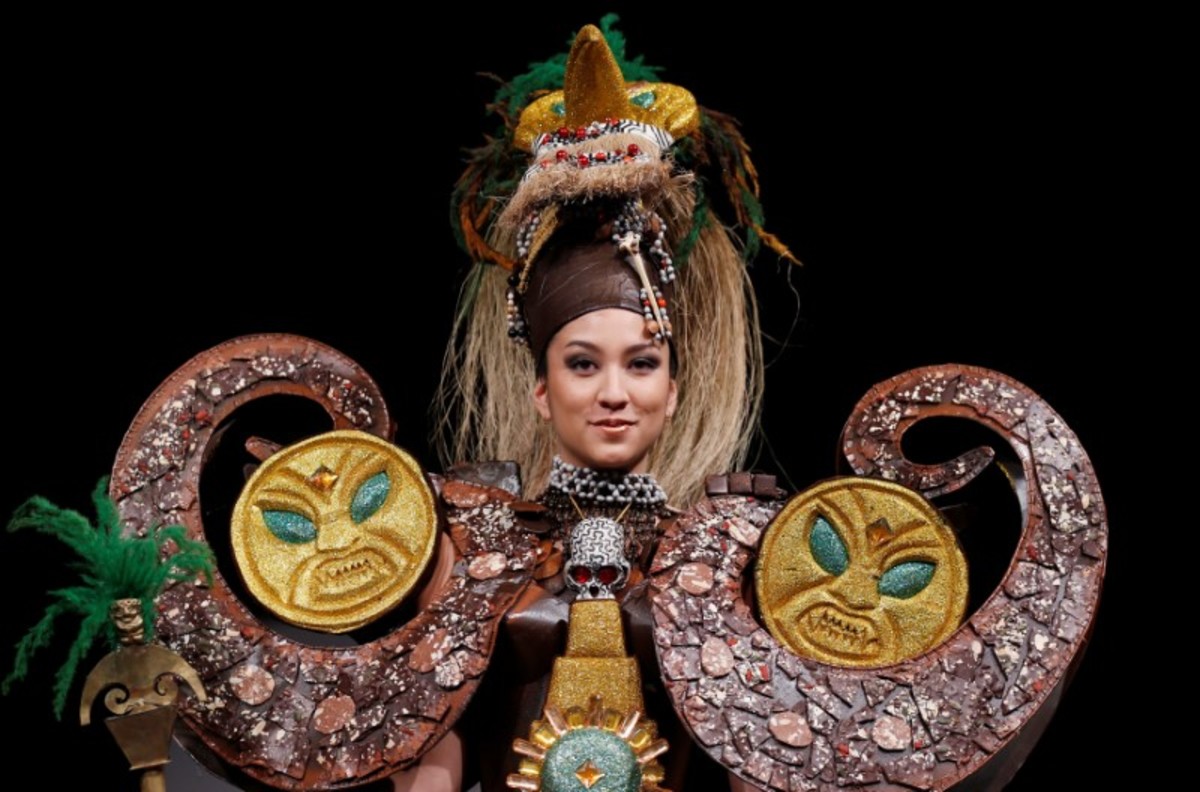 A model dressed in an outfit made with chocolate presents a creation at the Brussels chocolate fair, Belgium, March 1, 2018. REUTERS/Francois Lenoir