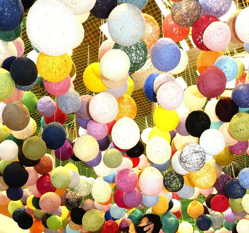 The grand prize went to work by an art club of the prefectural government-run Imabari Higashi junior high and high school. About 500 colorful spheres, each about 15 centimeters to 30 centimeters in diameter, were hung from the ceiling. They were made by wrapping threads around balloons, then hardening them. The spheres made with green and white threads look like muskmelon.