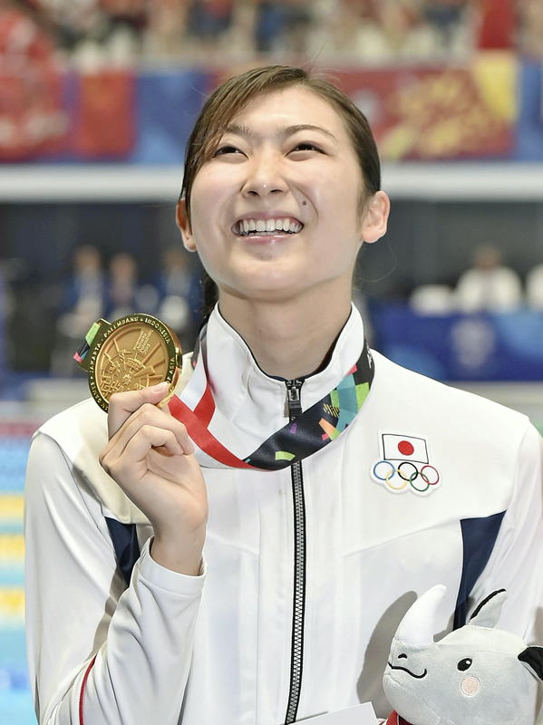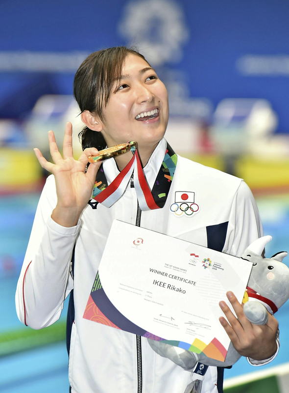 Rikako Ikee shows off her gold medal after winning the women's 50-meter freestyle at the 2018 Asian Games in Jakarta on Friday. (Credit: The Yomiuri Shimbun)Rikako Ikee reacts after winning the women's 50-meter freestyle at the 2018 Asian Games in Jakarta on Friday. (Credit: The Yomiuri Shimbun)