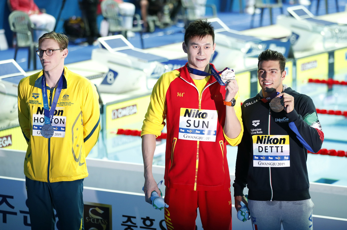 After finishing runner-up to Sun in the 400 freestyle on Sunday, Olympic champion Horton took his silver medal and then stood behind the podium while his Chinese rival and bronze medallist Gabriele Detti shared the spotlight.