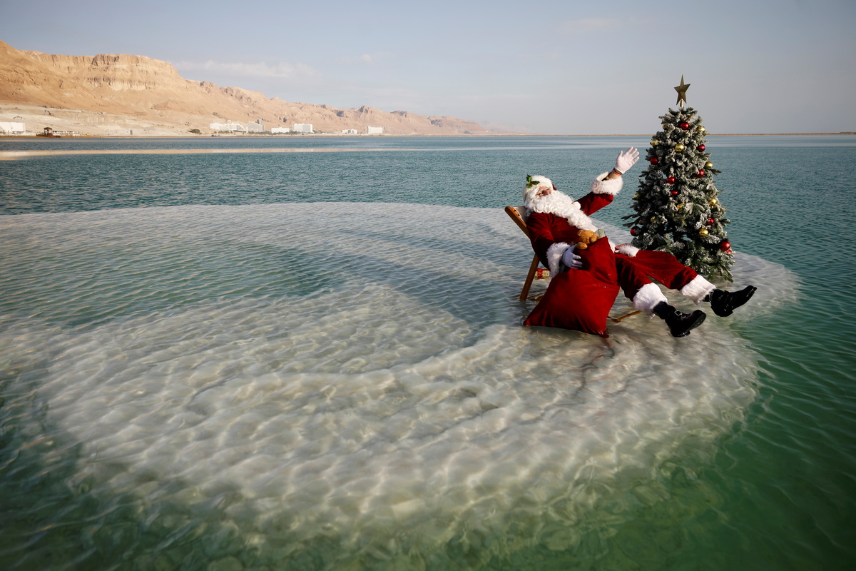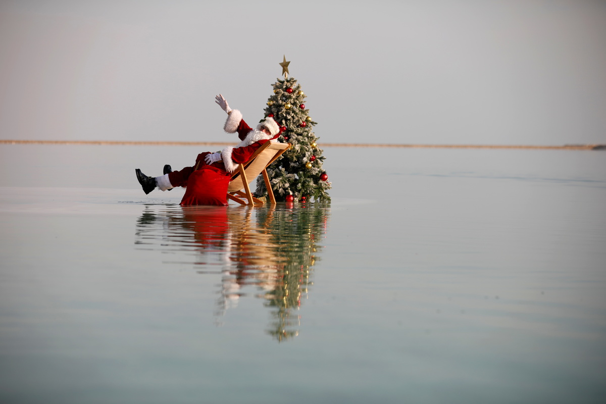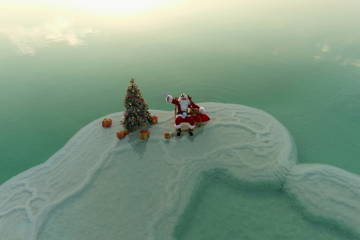 At the lowest point on earth, in the middle of a giant salt lake where animals and plants have no chance of surviving, a jolly man dressed in red with a flowing white beard stuck a Christmas tree in the ground and went for a swim.