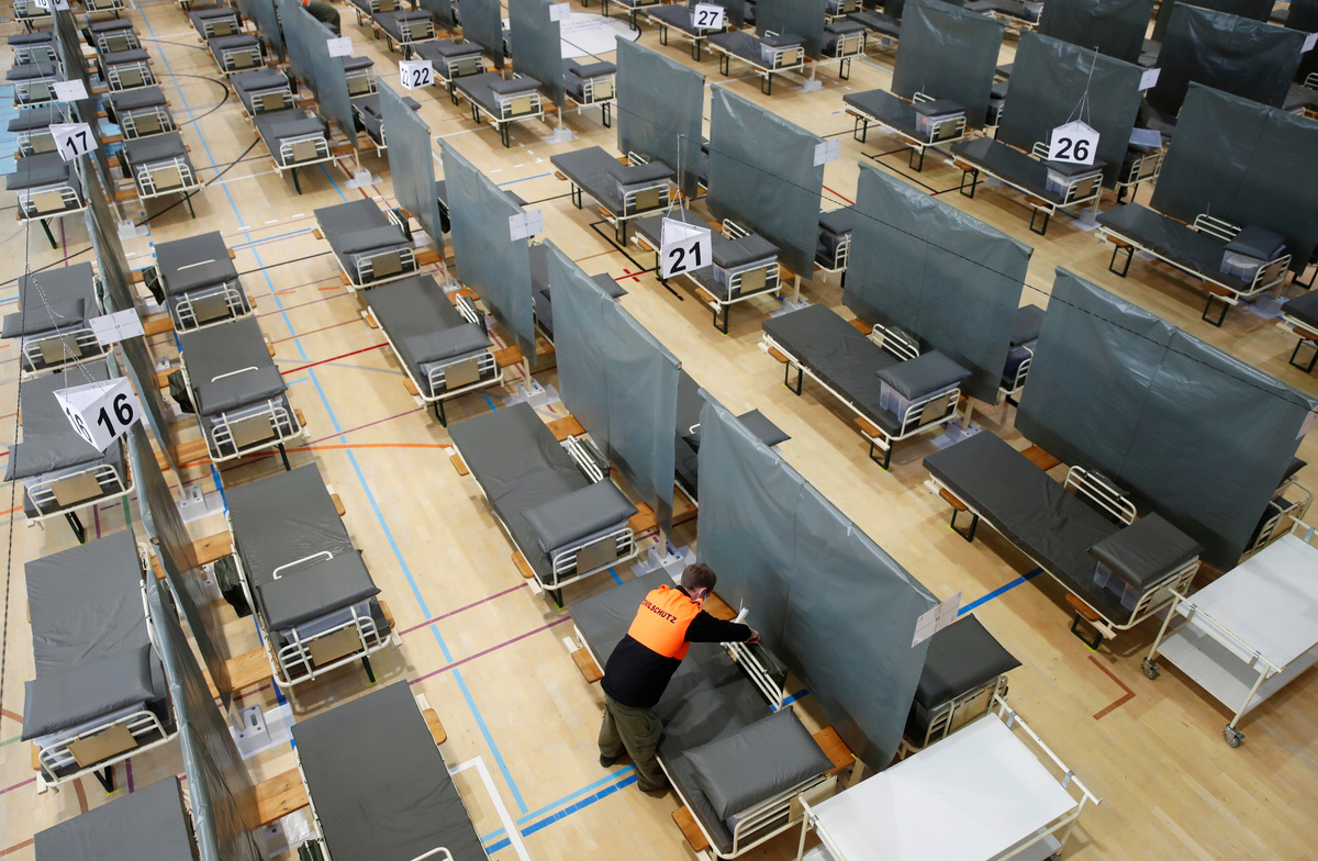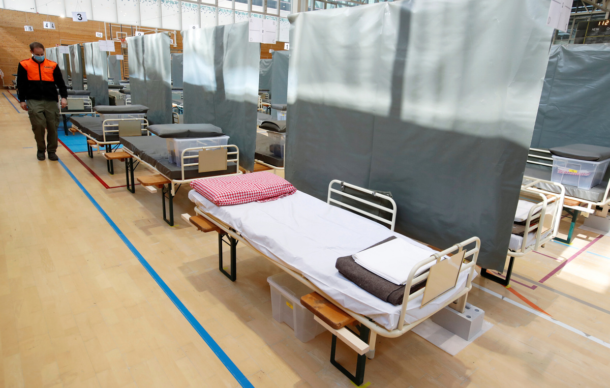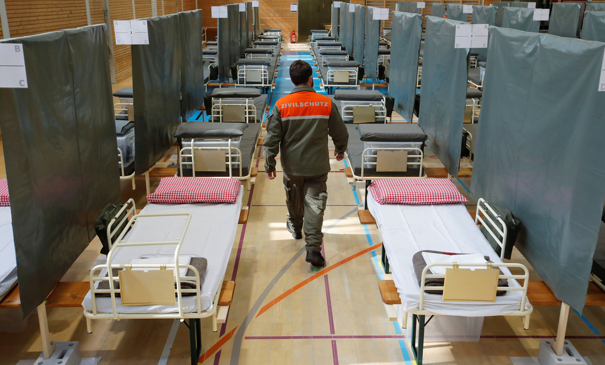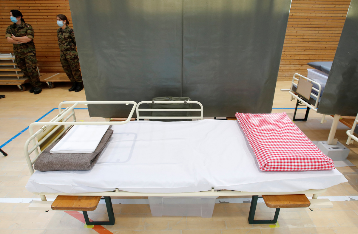 A civil defence worker walks past beds of the Medical Center Luzern (MCL) which can offer some 220 additional beds for patients of the coronavirus disease (COVID-19) at a gym in Nottwil, Switzerland April 6, 2020. REUTERS/Arnd WiegmannA civil defence worker prepares a bed of the Medical Center Luzern (MCL) which can offer some 220 additional beds for patients of the coronavirus disease (COVID-19) at a gym in Nottwil, Switzerland April 6, 2020. REUTERS/Arnd WiegmannA bed of the Medical Center Luzern (MCL), which can offer some 220 additional beds for patients of the coronavirus disease (COVID-19), is pictured at a gym in Nottwil, Switzerland April 6, 2020. REUTERS/Arnd WiegmannCivil defence workers prepare beds of the Medical Center Luzern (MCL) which can offer some 220 additional beds for patients of the coronavirus disease (COVID-19) at a gym in Nottwil, Switzerland April 6, 2020. REUTERS/Arnd WiegmannA civil defence worker places a sticker on a bed of the Medical Center Luzern (MCL) which can offer some 220 additional beds for patients of the coronavirus disease (COVID-19) at a gym in Nottwil, Switzerland April 6, 2020. REUTERS/Arnd Wiegmann