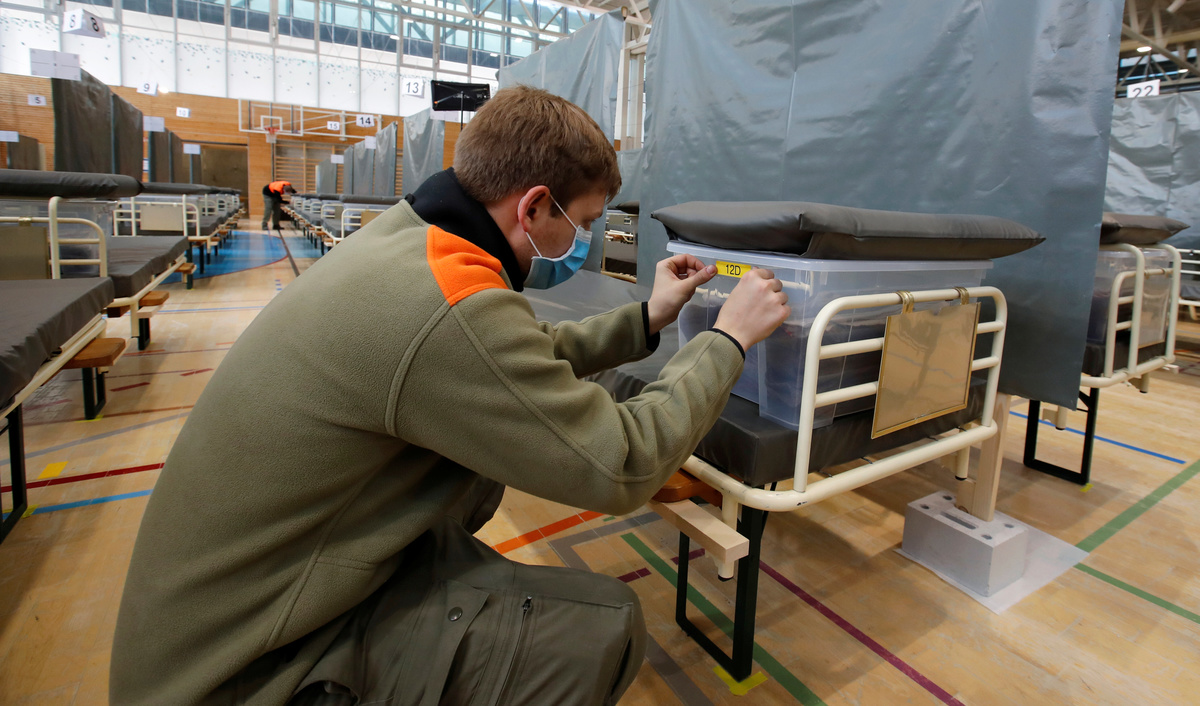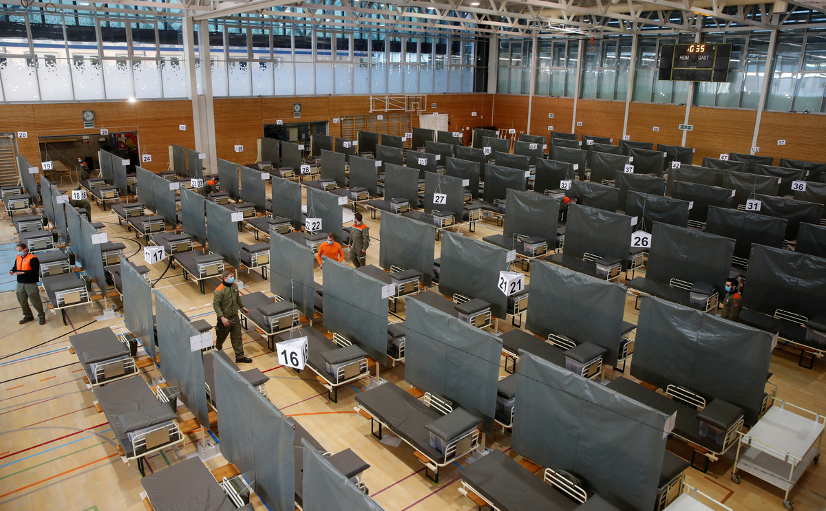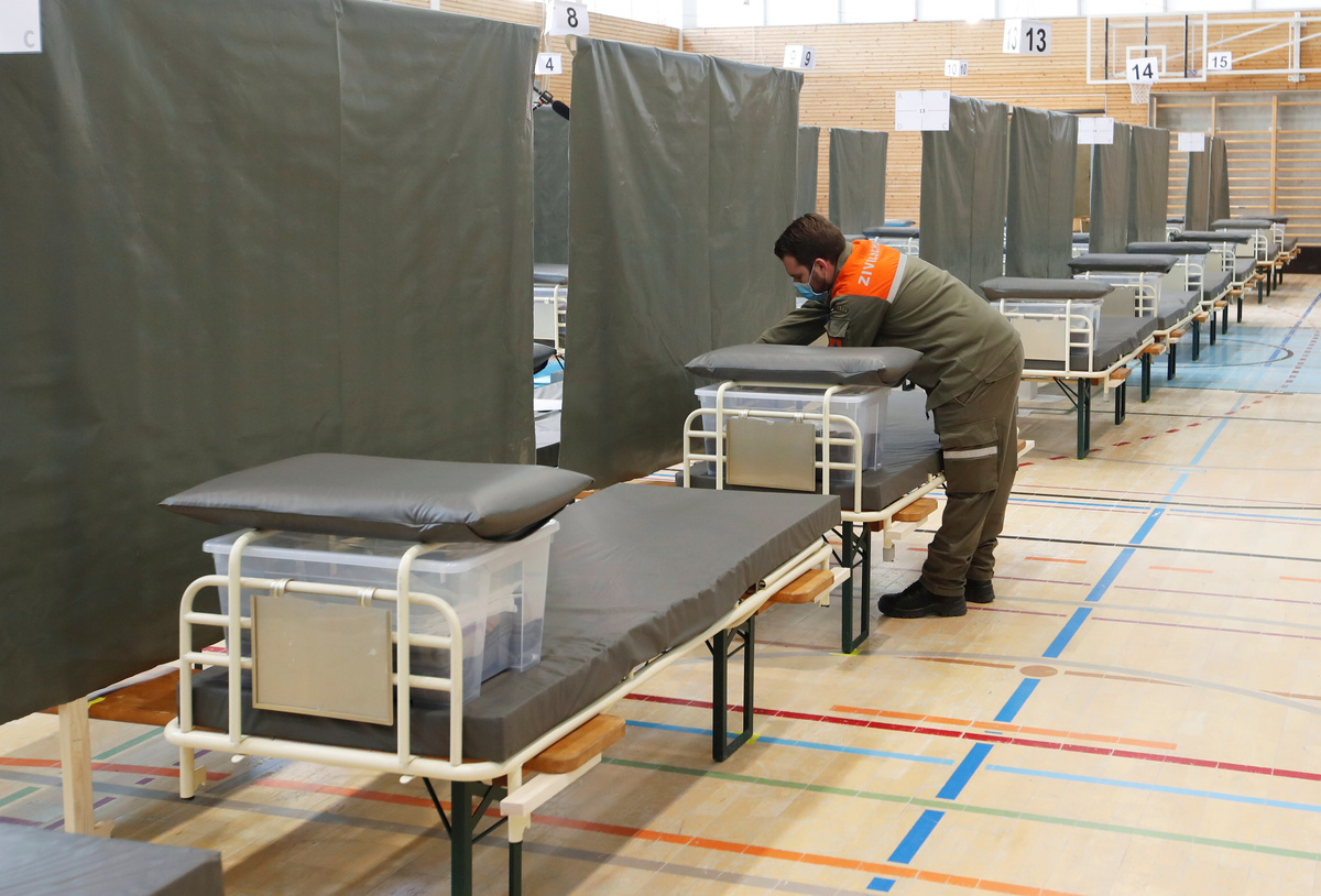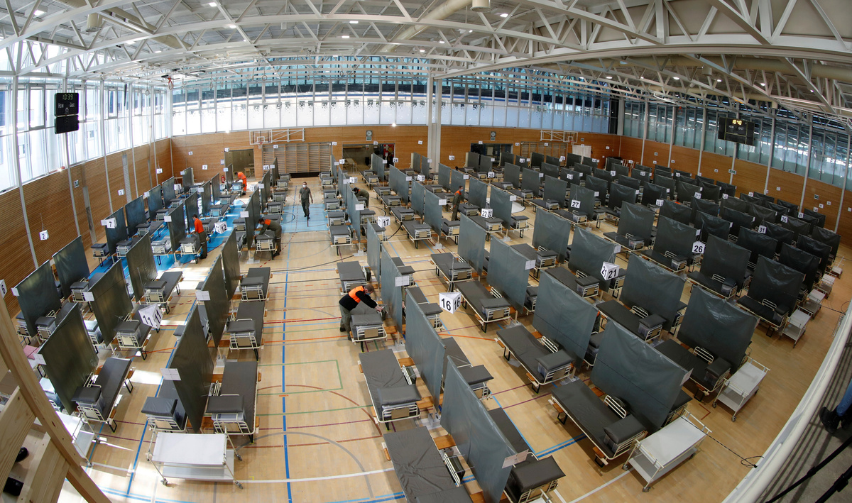 A civil defence worker walks past beds of the Medical Center Luzern (MCL) which can offer some 220 additional beds for patients of the coronavirus disease (COVID-19) at a gym in Nottwil, Switzerland April 6, 2020. REUTERS/Arnd WiegmannA civil defence worker prepares a bed of the Medical Center Luzern (MCL) which can offer some 220 additional beds for patients of the coronavirus disease (COVID-19) at a gym in Nottwil, Switzerland April 6, 2020. REUTERS/Arnd WiegmannA bed of the Medical Center Luzern (MCL), which can offer some 220 additional beds for patients of the coronavirus disease (COVID-19), is pictured at a gym in Nottwil, Switzerland April 6, 2020. REUTERS/Arnd WiegmannCivil defence workers prepare beds of the Medical Center Luzern (MCL) which can offer some 220 additional beds for patients of the coronavirus disease (COVID-19) at a gym in Nottwil, Switzerland April 6, 2020. REUTERS/Arnd WiegmannA civil defence worker places a sticker on a bed of the Medical Center Luzern (MCL) which can offer some 220 additional beds for patients of the coronavirus disease (COVID-19) at a gym in Nottwil, Switzerland April 6, 2020. REUTERS/Arnd Wiegmann