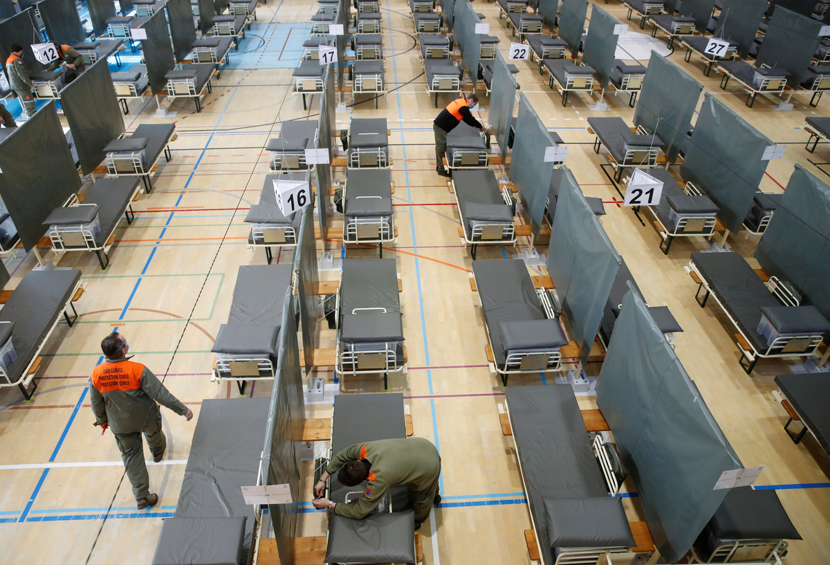 Civil defence workers prepare beds of the Medical Center Luzern (MCL) which can offer some 220 additional beds for patients of the coronavirus disease (COVID-19) at a gym in Nottwil, Switzerland April 6, 2020. REUTERS/Arnd Wiegmann
