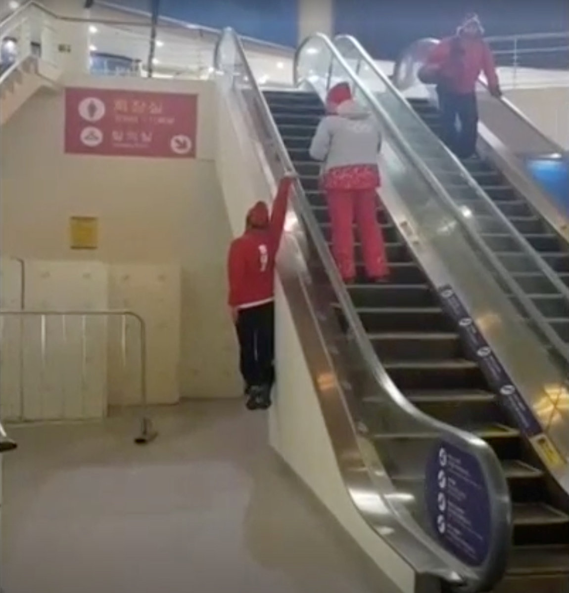 In one video, a team member hangs onto the wrong side of the escalator as it climbs upward.