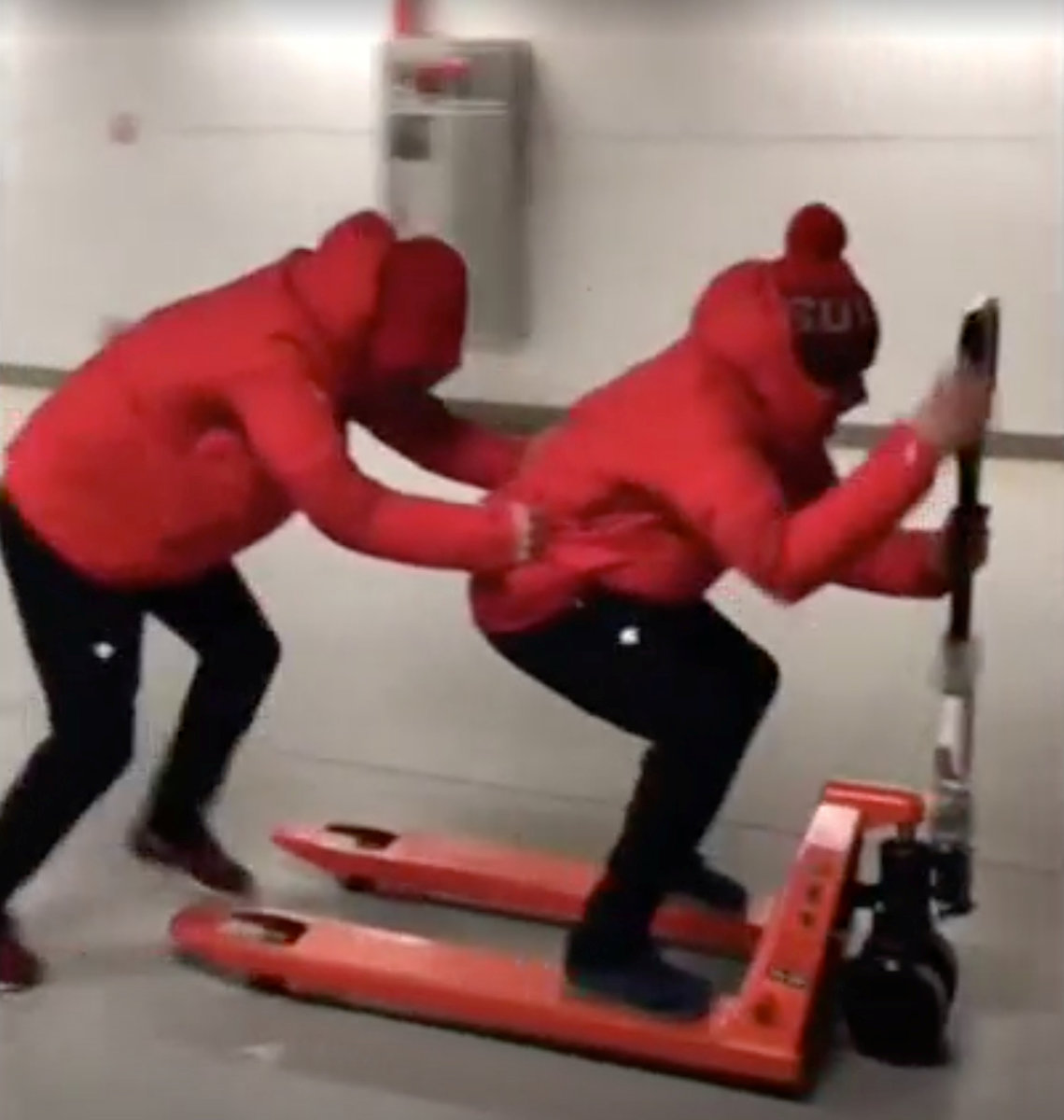 Videos of athletes hanging onto an escalator and using a trolley as a makeshift bobsleigh have gone viral since they were uploaded to the Swiss ski team's Instagram account.