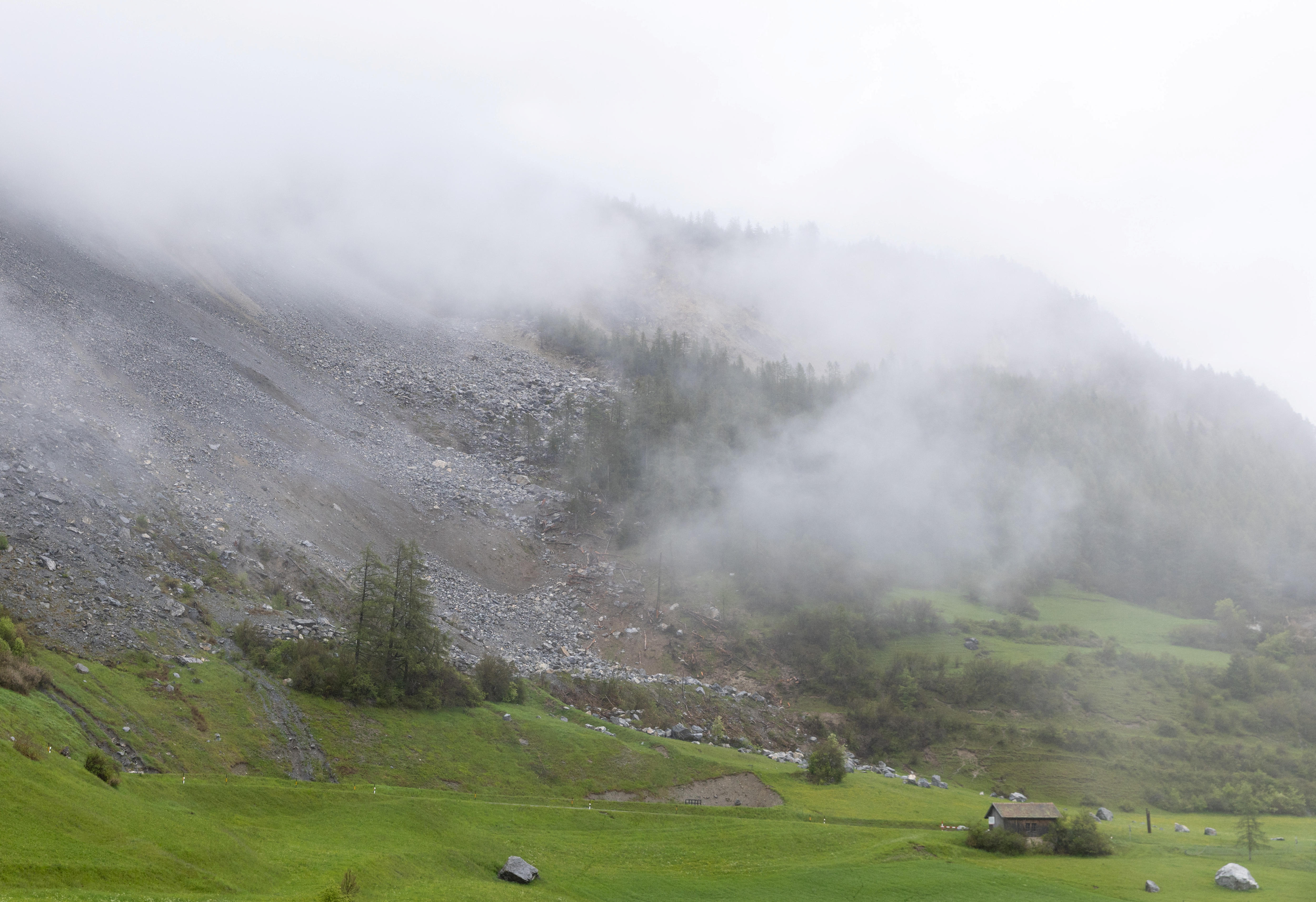 A thick coat of fog covered the mountaintop overlooking the village of Brienz on Thursday, where vegetation has been replaced by a slope of mud and rocks.