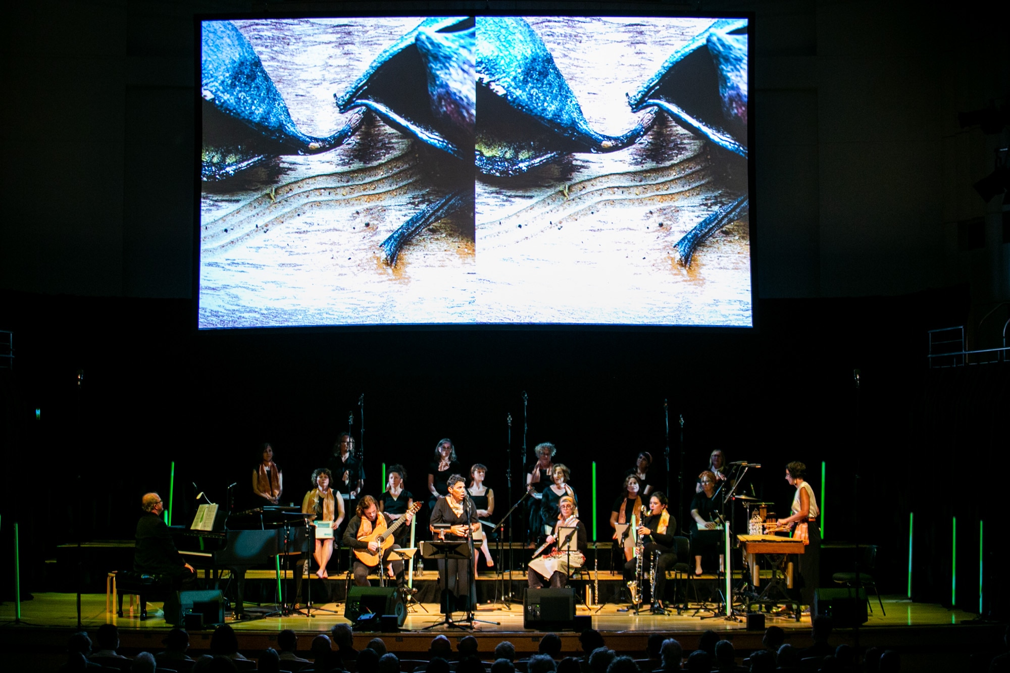 On stage, Simpson talked and sang accompanied by a five-piece ensemble and a 15-voice choir, while her sister and cousin's works were projected on a large screen above.