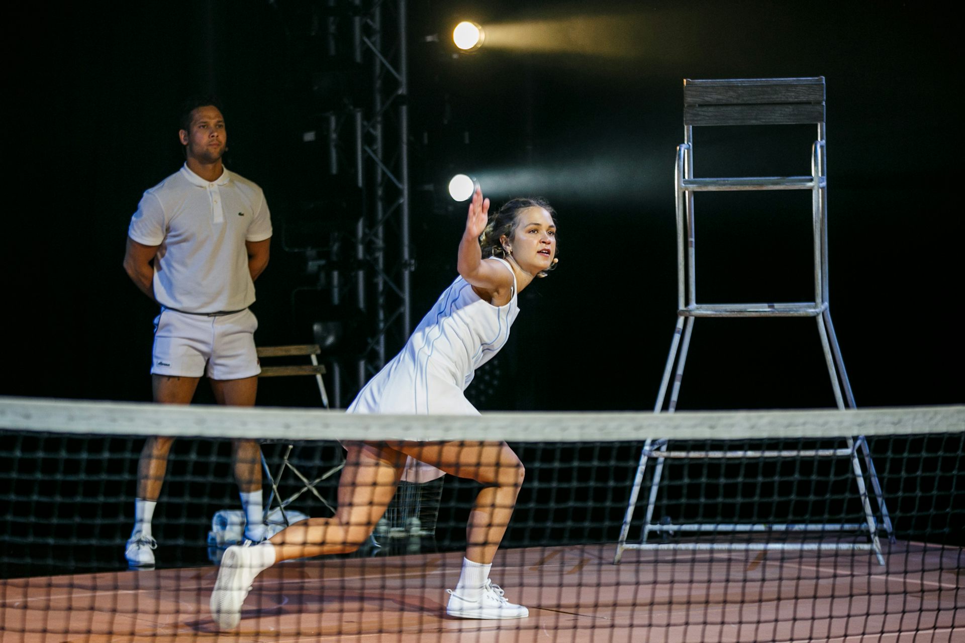 The tennis court set, designed in the traverse by Romanie Harper, is simple but effective and brought to life by video designer Mic Gruchy’s animated projections.