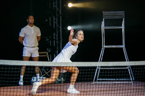 One by one, the actors enter, warming up in their white tennis outfits. Taking her place on top of the umpires chair, Evonne (Yued/Wiilman actor Tuuli Narkle) throws a fishing line into the Murrumbidgee river.