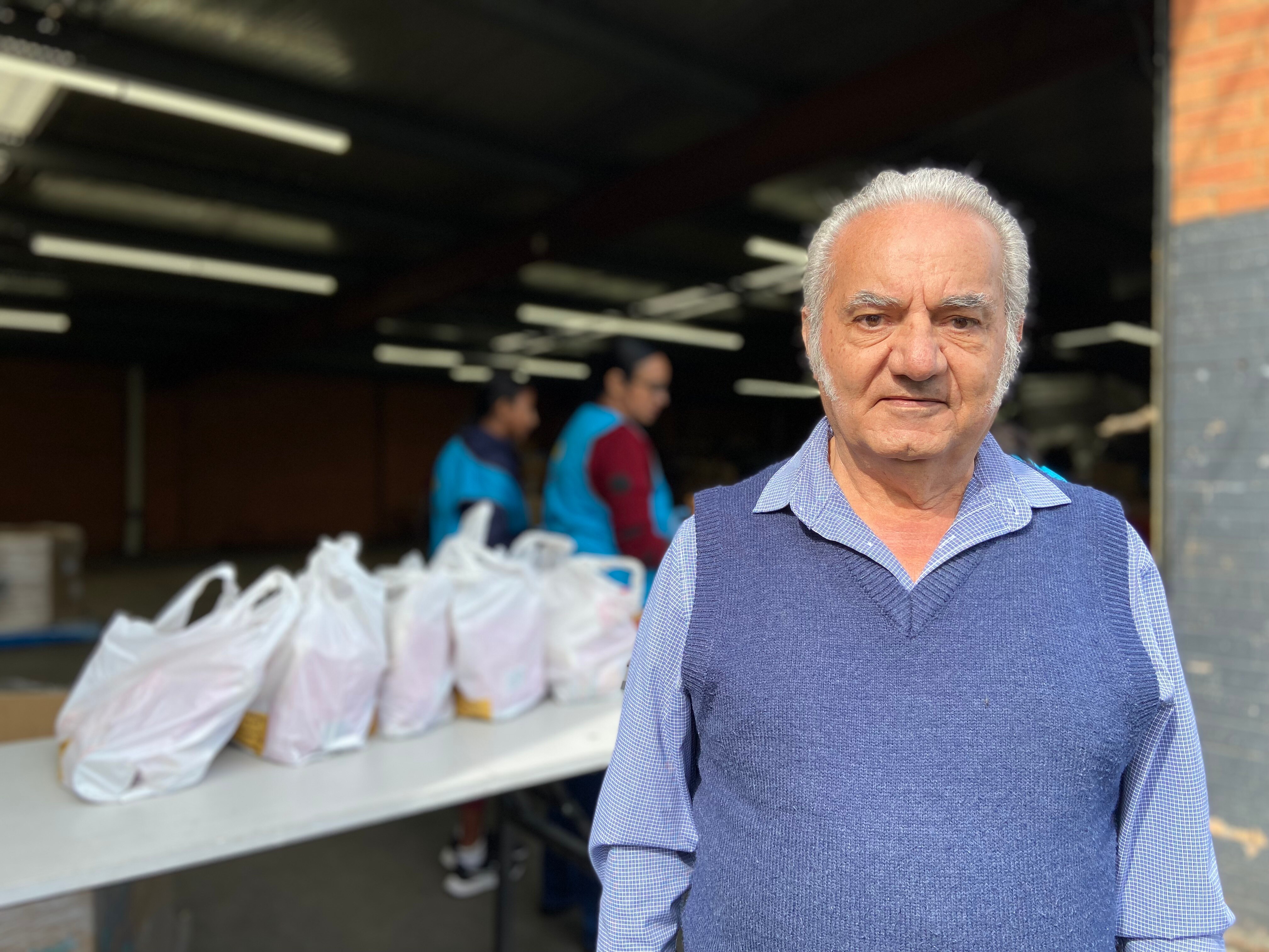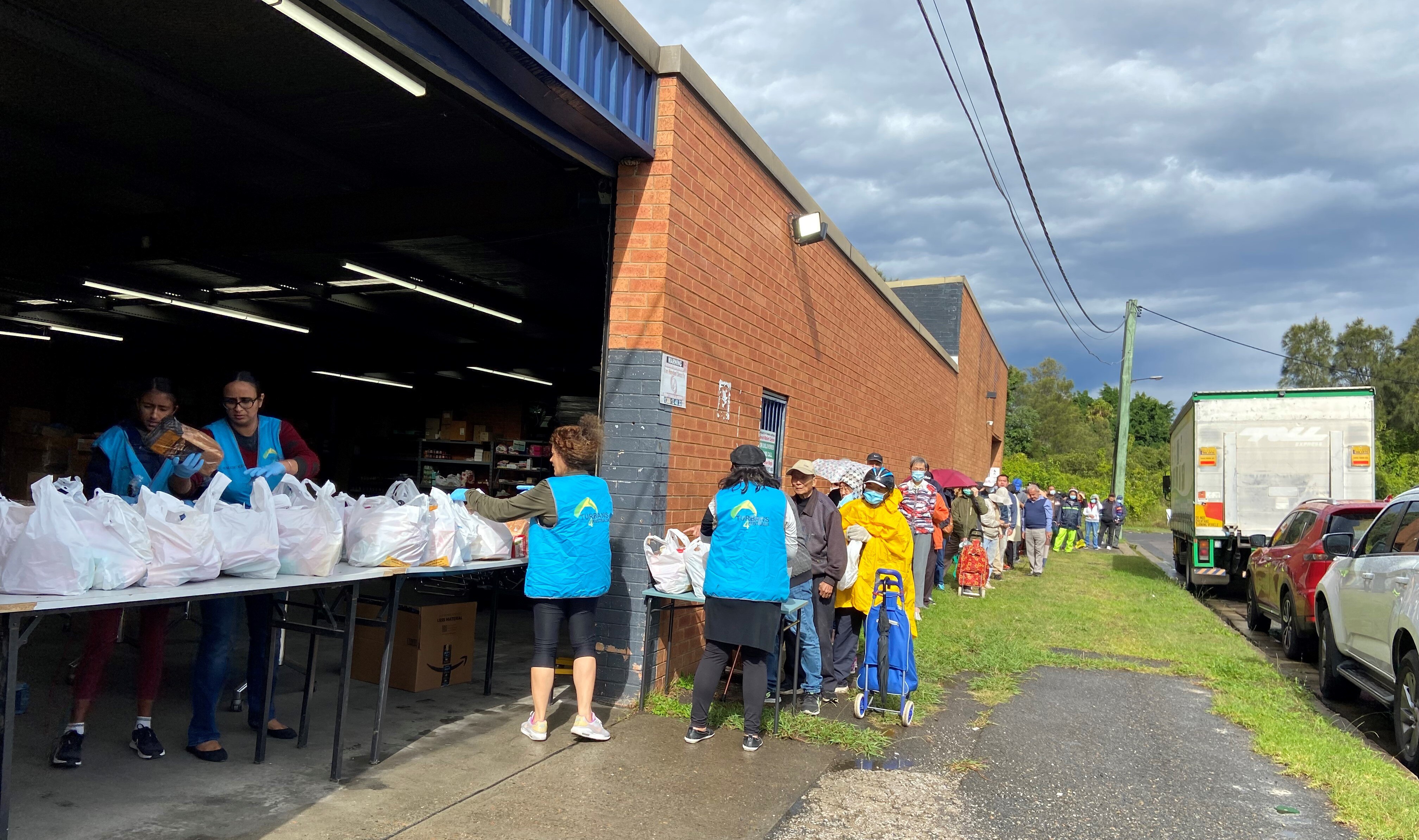 In the Western Sydney suburb of Clyde, Ararat Ghookassian is among hundreds of people who have braved the rain and lined up to collect food hampers from the charity, Turbans 4 Australia.