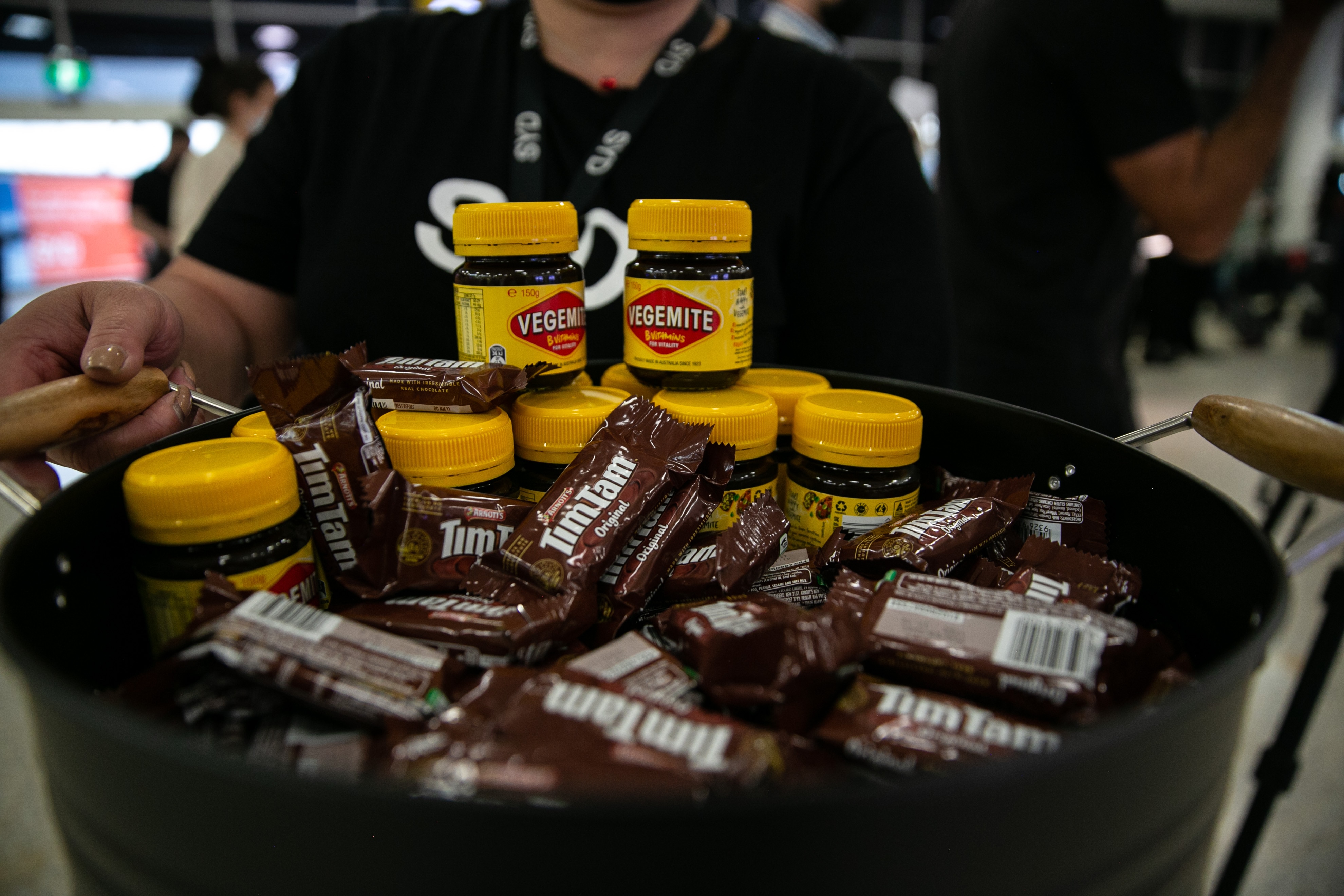 Vegemite and Tim Tams were on offer to passengers who were the first to land this morning.