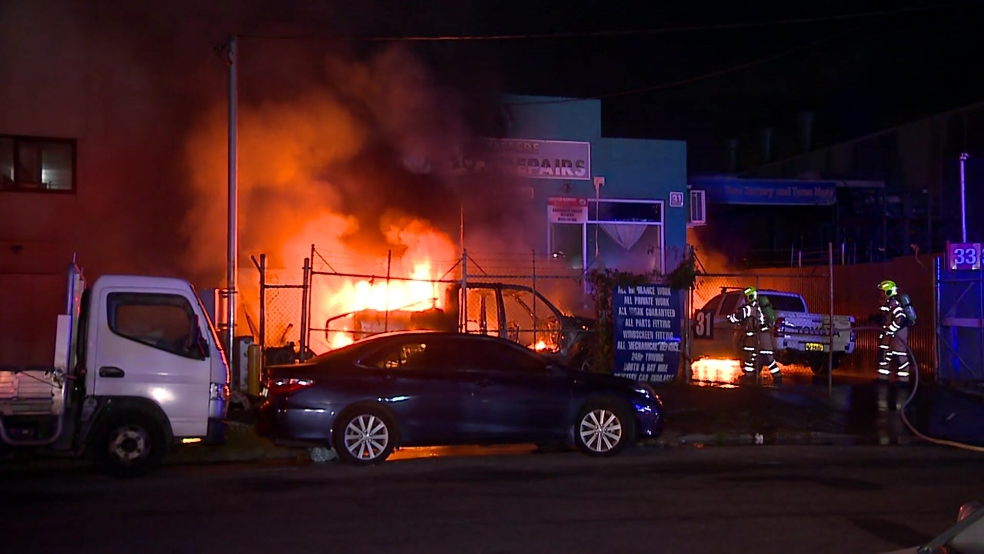 Two cars were found well alight when emergency services arrived at the business in Claremont Street, Greenacre last night.