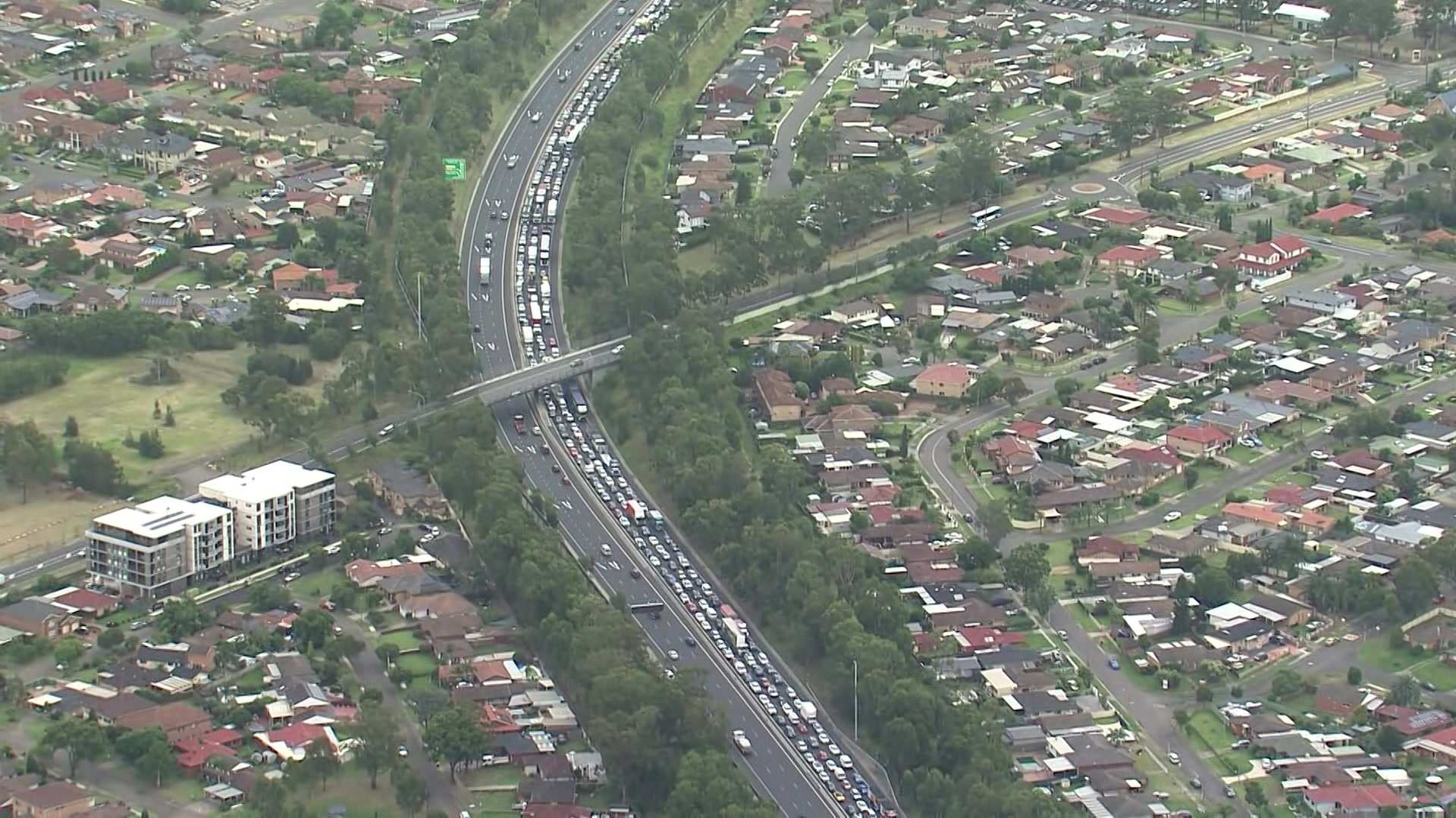 )Traffic on the M5 Motorway is backed up for kilometres following a two-car crash in Sydney's south-west.