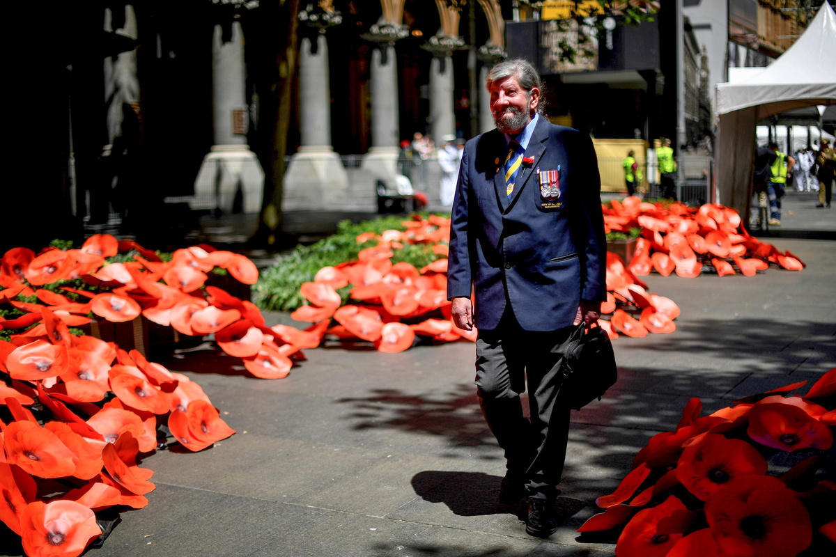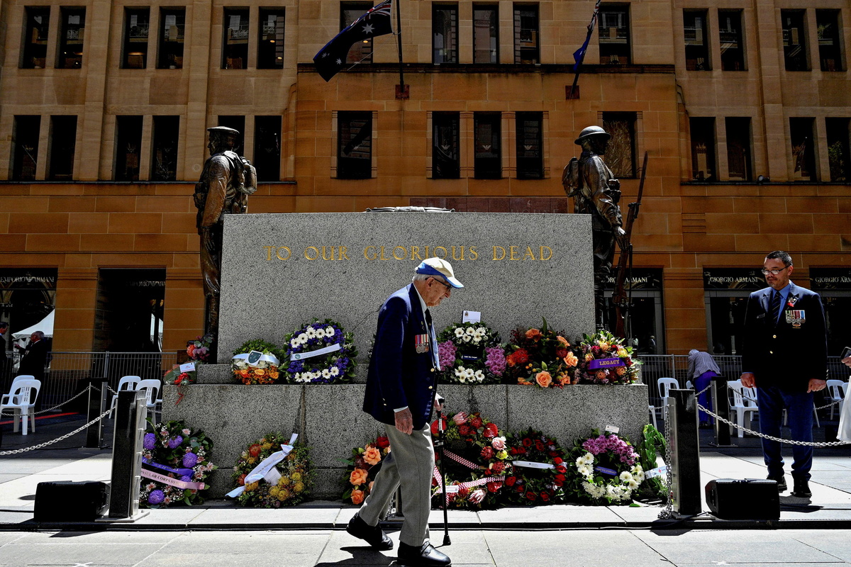 A veteran walks past after laying a wreath during a Remembrance Day Service at Martin Place in Sydney, Australia on November 11, 2020. Saeed Khan/Pool via REUTERSA member of the public leaves after the Remembrance Day Service at Martin Place in Sydney, Australia November 11, 2020. Saeed Khan/Pool via REUTERS