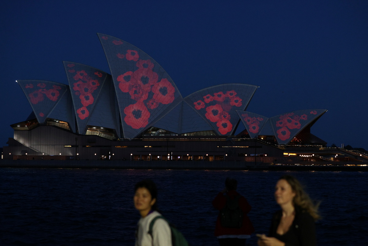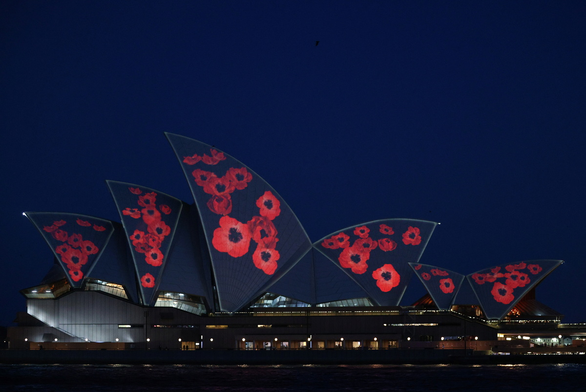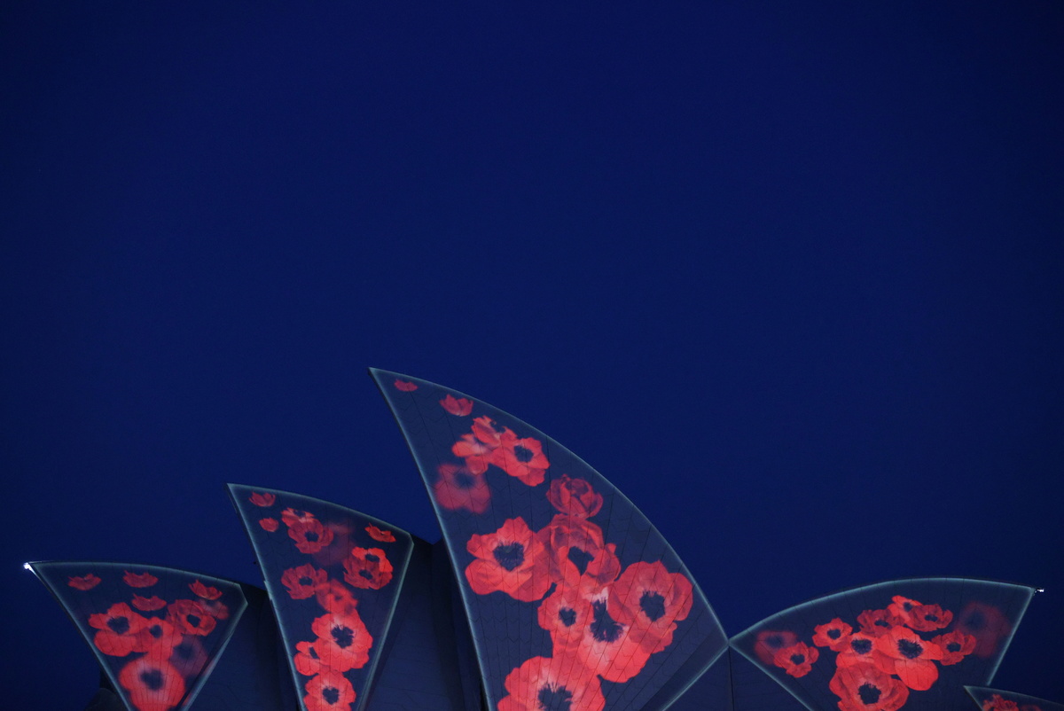 Poppies illuminated the sails of the Sydney Opera House at dawn on Wednesday as Australia marked the 102nd anniversary of Remembrance Day.