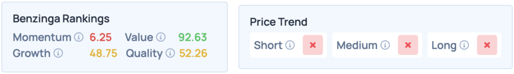 The stock scores poorly in Benzinga’s Edge Stock Rankings, with an unfavorable price trend in the short, medium and long terms. Click here for more insights into the stock.