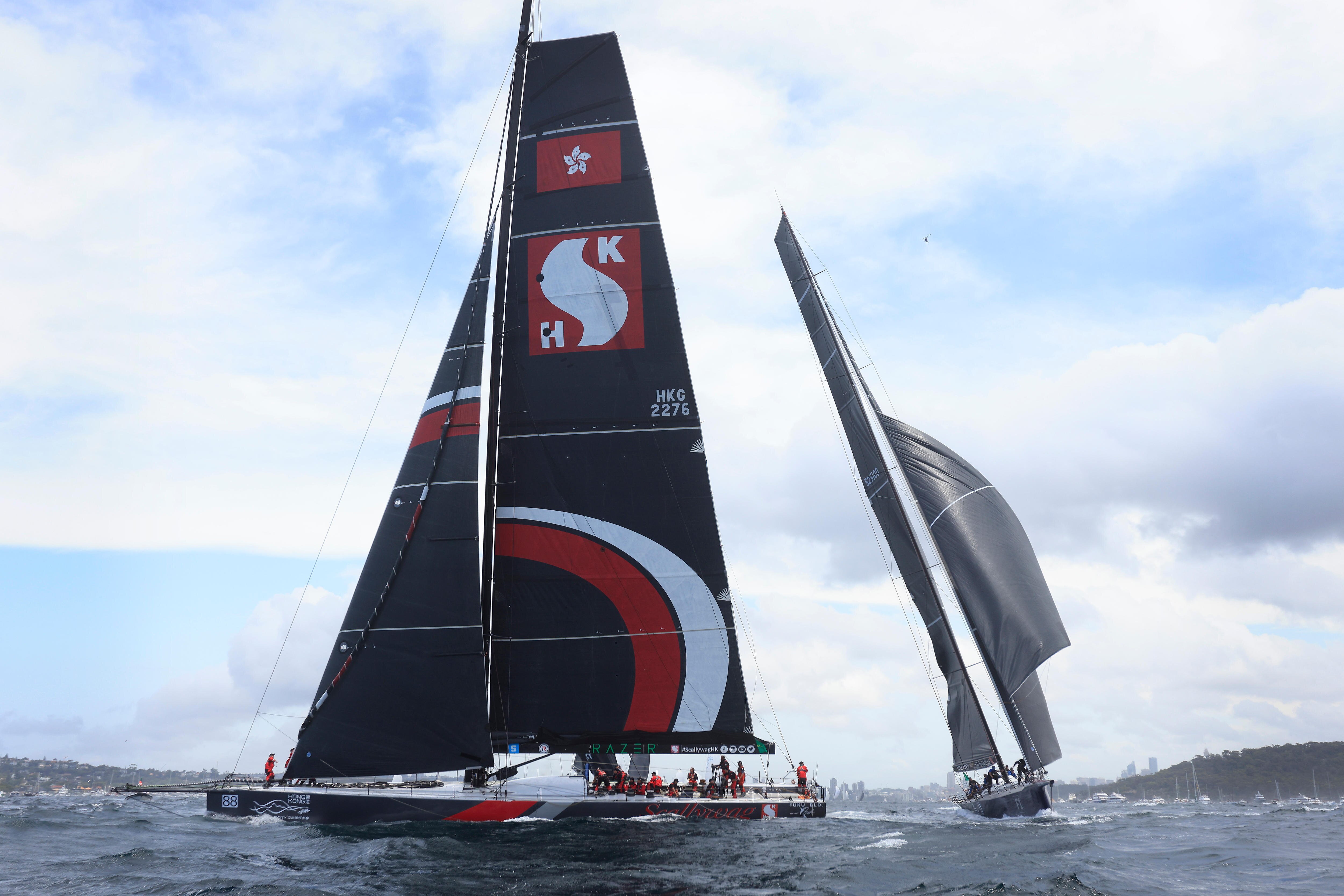 One of the three main contenders for Sydney to Hobart line honours, SHK Scallywag, hits early trouble with a sail problem, but it's a close race with LawConnect ahead as the fleet heads south entering night one. Look back on all the action.