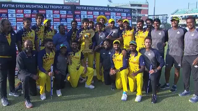 CHENNAI: M Shahrukh Khan (33 n.o., 1x4, 3x6) and Sai Kishore (4-0-12-3 with the ball and an unbeaten 6) were the architects of Tamil Nadu's four-wicket win over Karnataka that helped them retain the Syed Mushtaq Ali T20 crown at the Feroz Shah Kotla in New Delhi on Monday. Tamil Nadu --- chasing 152 --- needed 16 from the last over with Shahrukh and Sai Kishore in the middle. The equation boiled down to 5 off the last ball and Shahrukh's six over deep square-leg region off left-arm pacer Prateek Jain (1-34) took Tamil Nadu past the finish line and sparked wild celebrations in the dugout.