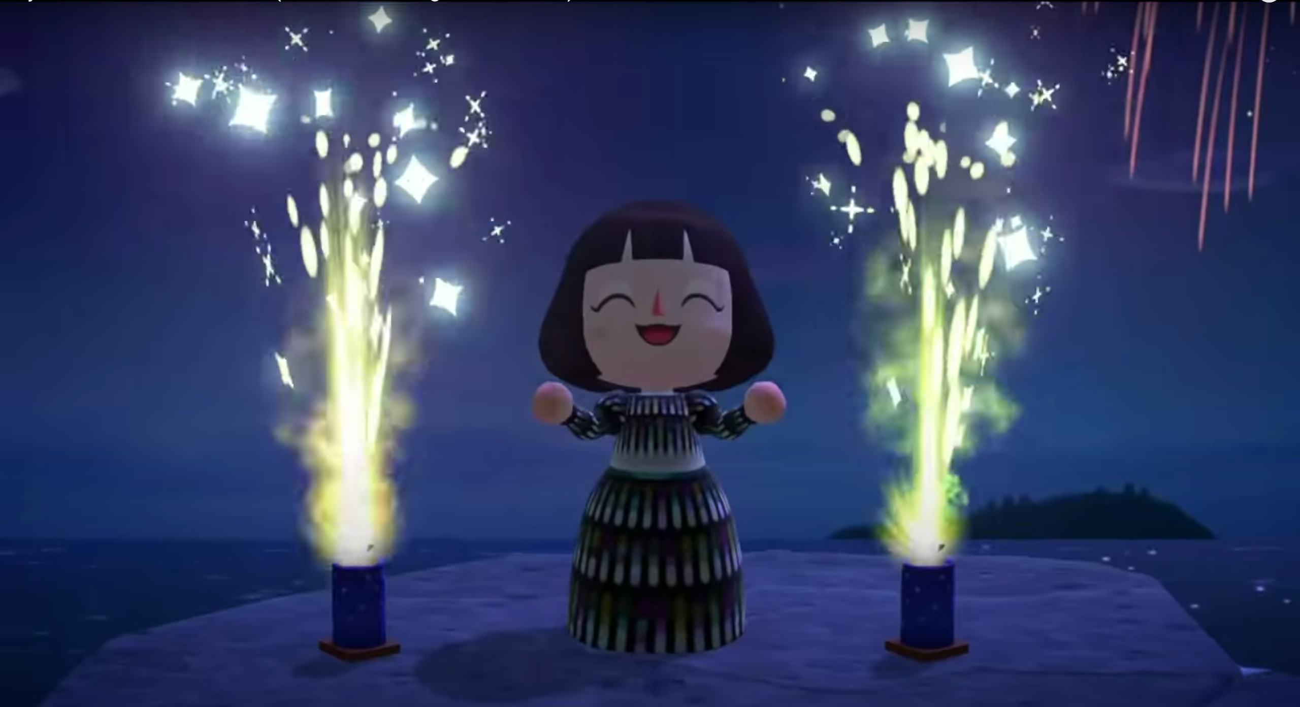 Bandmate and husband Nick Sanborn also makes a few appearances, far more in fact than he does in the live-action video for the song (below), which features somewhat more exuberant choreography of Meath dancing than is possible in Animal Crossing: New Horizons. It's great to see the band taking advantage of the game's recently added custom fireworks feature to display its logo... rather than dick doodles.