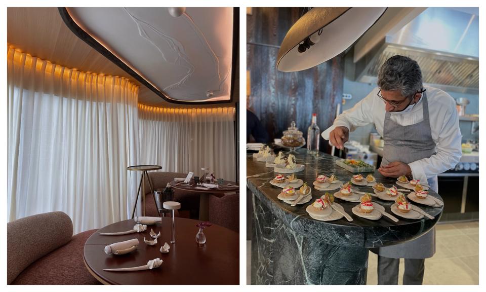 You'll find the chef's restaurant at the Grandes Alpes Hotel & Spa in the heart of Courchevel in a brand new space designed like a cocoon of light flowing fabrics coiffed by a lick of white organically molded ceiling recalling the shell of a crab or sea urchin as an ode to nature, co-created by Wahid and designers Tristan Auer and Jérôme Bugara.