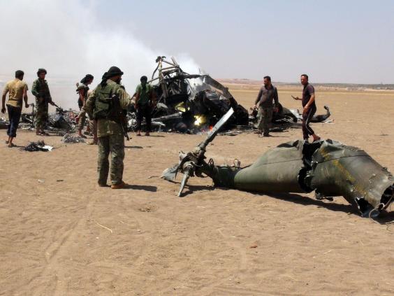 The Mi-8 transport helicopter was brought down by ground fire in Idlib province while returning to Hemeimeem air base after delivering humanitarian goods to Aleppo, the ministry said. It said all three crew members and two military officers on board died.