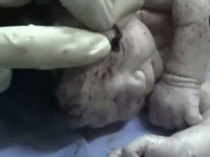 Graphic footage posted on Facebook by the Aleppo City Medical Council showed doctors, delivering the lifeless and pale child, who had a piece of shrapnel that had pierced her mother's womb embedded in her forehead.