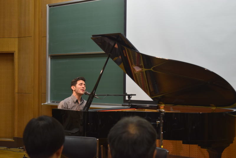 Aeham Ahmad, 30, grew up in a Palestinian refugee camp in Yarmouk, Syria. On Sunday he sang Arabic songs accompanied by piano at the University of Tokyo, including a song about a friend from the camp whose pregnant wife died on her way to the hospital at a checkpoint installed by the Syrian government.