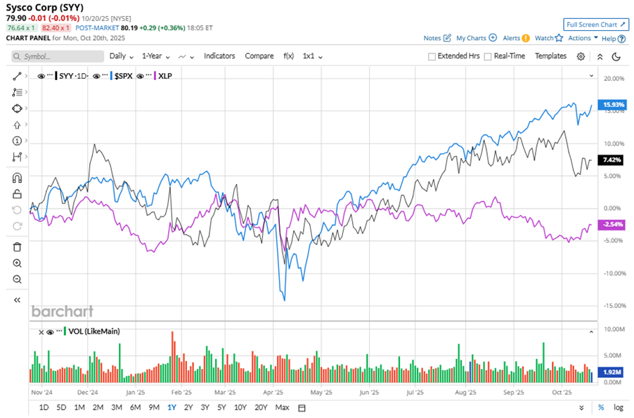 SYY stock has underperformed the S&P 500 Index’s ($SPX) 14.8% gains over the past 52 weeks, with shares up 5.8% during this period. However, it outperformed the Consumer Staples Select Sector SPDR Fund’s (XLP) 3.1% losses over the same time frame.