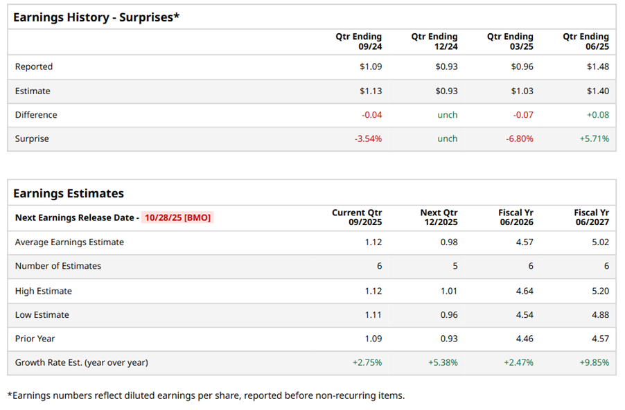 Sysco Corporation (SYY), headquartered in Houston, Texas, markets and distributes various food and related products to the foodservice or food-away-from-home industry. Valued at $38.2 billion by market cap, the company also distributes personal care guest amenities, housekeeping supplies, room accessories, and textiles to the lodging industry. The food service giant is expected to announce its fiscal first-quarter earnings for 2026 before the market opens on Tuesday, Oct. 28.